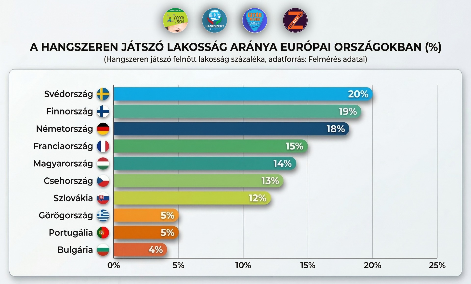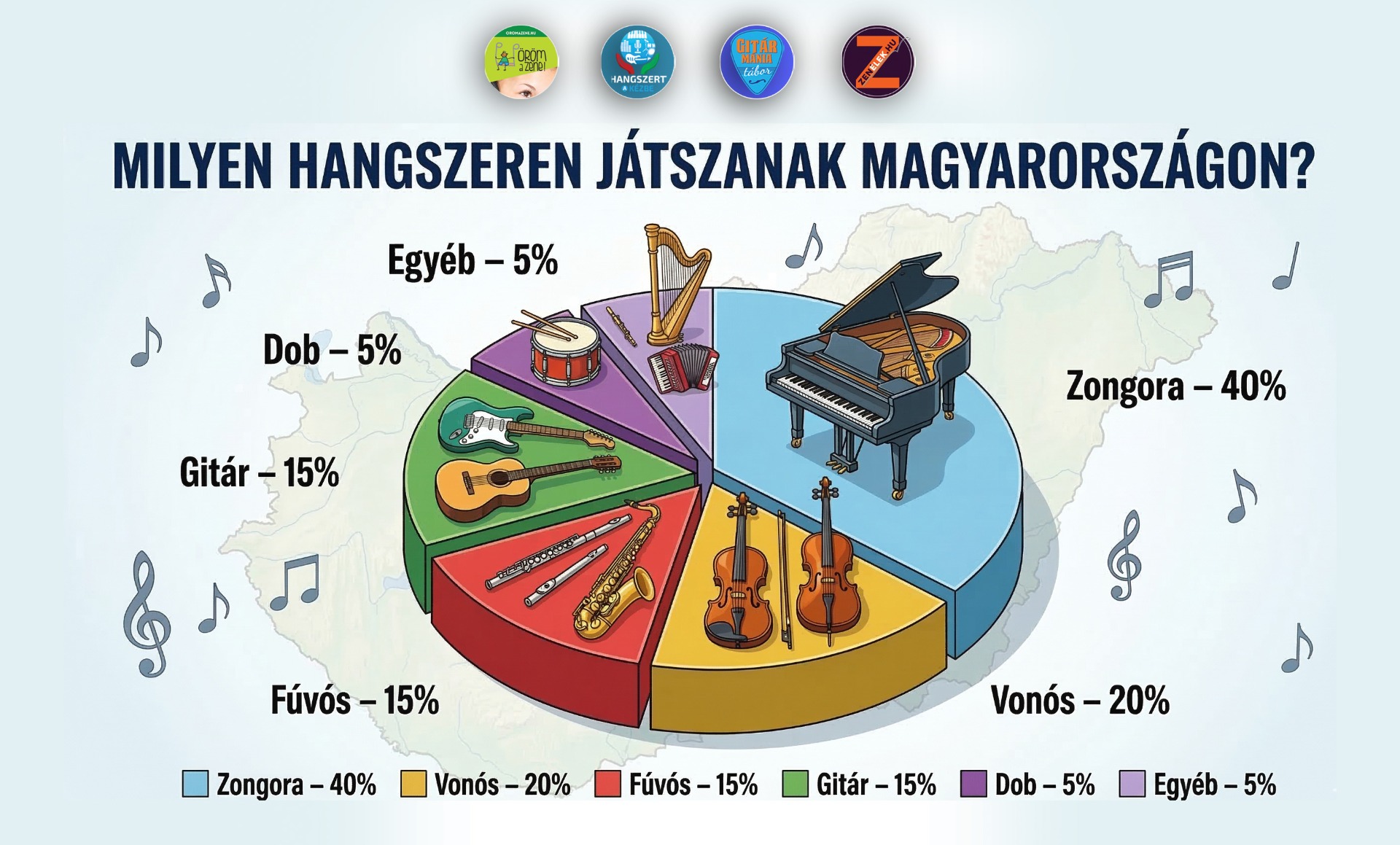 Majdnem megduplázódott a hangszeren játszók aránya Magyarországon az elmúlt húsz évben. Míg 2006-ban a lakosság 8 százaléka tudott zenélni, ma már 14 százalék vallja ezt magáról. A növekedés ellenére a hazai számok továbbra is elmaradnak a nyugat- és észak-európai országokétól.
